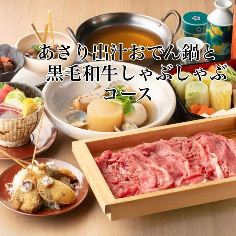 あさり出汁おでんと、でーもん自慢のあさり出汁を使用した黒毛和牛しゃぶしゃぶコースです。種類豊富な90分飲み放題付き5500円コースの御紹介です。御宴会、飲み会、忘年会等、ご利用ください。 @金山居酒屋/おでん/味噌おでん/創作おでん/串揚げ/創作串揚げ/名古屋飯/日本酒
