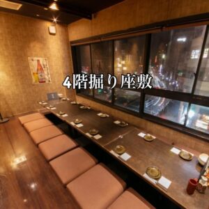 こちらは4階掘り炬燵席の御紹介です。夜景の綺麗な掘り座敷は12名様〜16名様までフロア貸し切り可能です。忘年会や御宴会におすすめ。 @金山居酒屋/おでん/味噌おでん/創作おでん/串揚げ/創作串揚げ/名古屋飯/日本酒