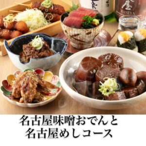 こちらは名古屋味噌おでんと名古屋めしコースの御紹介です。おでん屋でーもん自慢の名古屋味噌おでん、名古屋名物の手羽先唐揚げ…