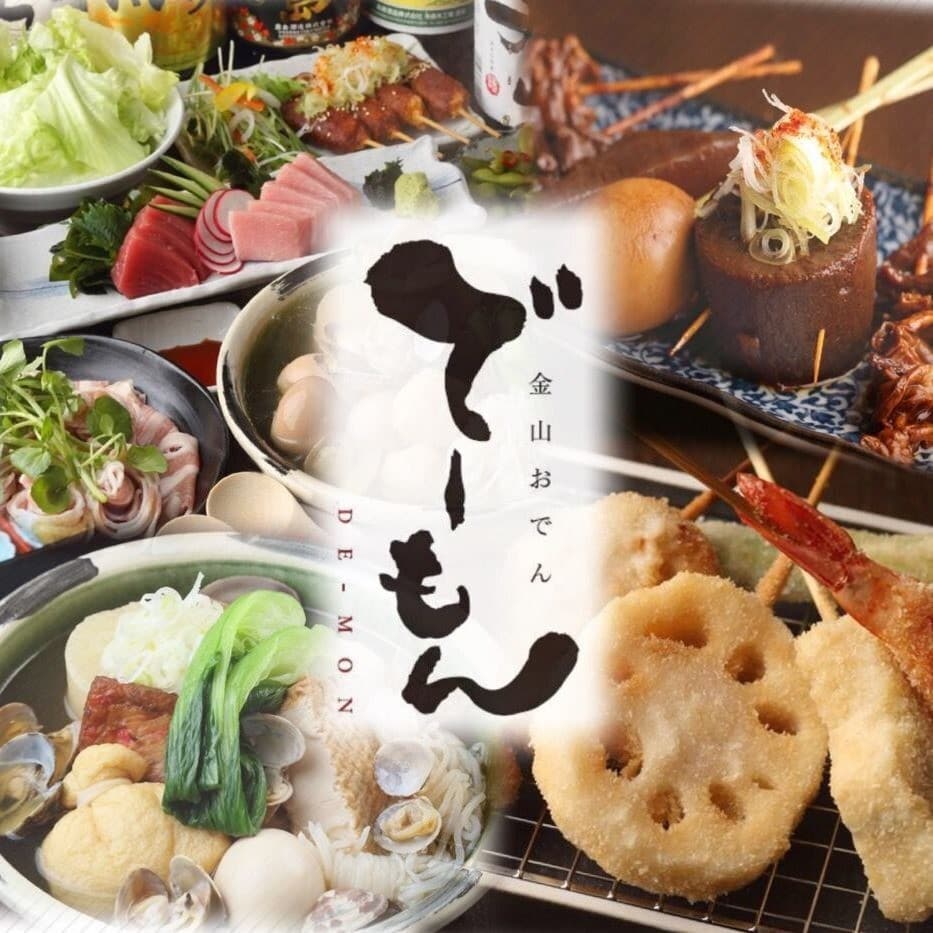 でーもん名物あさり出汁おでんと名古屋味噌おでん、創作串揚げのすべてを堪能できるコースとなっております♪種類豊富な飲み放題90分付き!送別会、会社飲み会、合コン、同窓会、デートなど各種ご宴会にご利用ください。
